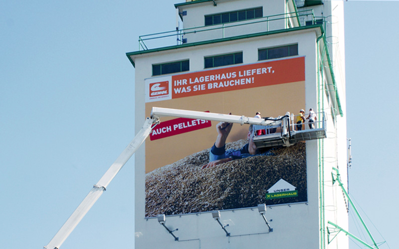 Großformatige Außenwerbung in einem Stück produziert und straff gespannt mit unseren Spanntuchanlagen.